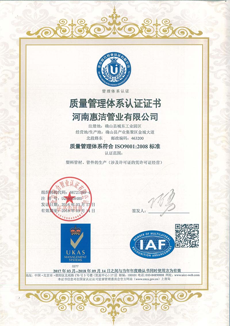 河南惠潔管業有限公司是一家專業從事高分子材料及其制品研究開發、生產制造、銷售、安裝一體的高新技術企業。公司成立于2007年,總投資六億五千萬元,注冊資金12030萬元。產品涵蓋了聚乙烯(PE)、聚丙烯(PP)、聚丁烯(PB)、聚氯乙烯(PVC)等四大系列,一千多種規格型號。其中PE無塔供水設備是我公司自主研發,自主創新的綠色環保節能產品,獲得了六項國家專利,并起草實施了行業標準。公司擁有駐馬店市特種塑料制品工程技術研究中心,獨立產品檢驗、試驗中心,設備先進,技術一流;企業全面通過了ISO9001:2008質量管理體系,ISO14001:2004環境管理體系,GB/T28001:2001職業健康安全管理體系認證;獲得了國家質量監督檢驗檢疫總局“特種設備制造許可”認證;先后榮獲了“中國著名品牌”“國家AAA級企業”“河南省著名商標”“河南名牌產品”、河南省“安康杯”優勝企業、河南省“百項職工優秀技術創新成果”獎、駐馬店市“品牌示范企業”“五十點擊查看