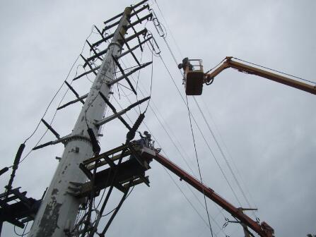 本次工作的關(guān)鍵點(diǎn)也是難點(diǎn),一是為滿足帶電體的安全距離,要在平臺處向外延伸出一根1.2米的槽鋼來支撐起絕緣子,延伸出去的槽鋼又不能支撐起作業(yè)人員的重量,作業(yè)全程都得依靠高空作業(yè)車才得以進(jìn)行,加上地面地形對作業(yè)車的限制,這給工作增加了很大的難度;二是體力的消耗,參與本次作業(yè)的小林說道,從上桿到下桿,在桿上整整呆了八個(gè)多小時(shí),連同吃中午飯都是在桿上解決,在兩天的時(shí)間里在共計(jì)在桿上的時(shí)間超過了十四個(gè)小時(shí)了,這一點(diǎn)對于作業(yè)人員的體力也是一個(gè)很大的考驗(yàn)的。廣西電網(wǎng)公司三級技能專家、電纜高級技師伍桂宏擔(dān)任本次工作的負(fù)責(zé)人,他統(tǒng)籌大局一邊指揮著工作,一邊為青年員工講解關(guān)于電纜的一些知識,在桿塔上的員工理解更加的深刻,此時(shí)相當(dāng)于是手把手的現(xiàn)場教學(xué)了,不僅能夠保證按時(shí)完成工作任務(wù),更多的是拓展的青年員工的知識面。學(xué)以致用不是紙上談兵,而是要充分的利用所學(xué)知識來解決實(shí)際中遇到的問題。