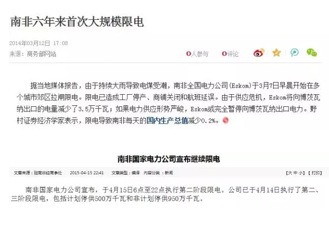 2016年,Eskom宣布公司已經徹底扭轉電力短缺局勢,電力處于供過于求的狀態。南非各行業應對電力供應前景保持樂觀,繼續投資興業。