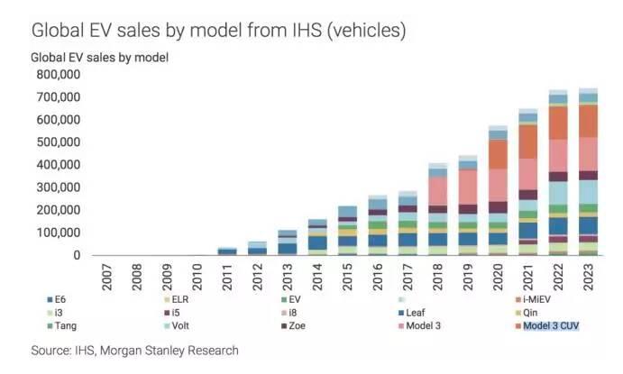 利用IHS公司的數據,摩根斯坦利通過模型預測全球電動汽車銷量,并得出結論:截止2020年,特斯拉Model 3和Model Y車型將占全球電動車市場的50%左右。