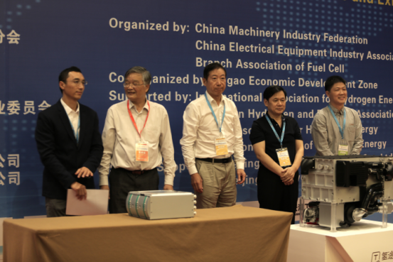 在本次氫能與燃料電池發(fā)展大會(huì)上,北京氫璞創(chuàng)能科技有限公司和浙江氫途科技有限公司分別發(fā)布了他們的第三代燃料電池電堆和第二代燃料電池系統(tǒng)。國(guó)際氫能學(xué)會(huì)副主席、清華大學(xué)核能與新能源技術(shù)研究院毛宗強(qiáng)教授、雄韜電源科技股份有限公司董事長(zhǎng)張華農(nóng)先生、首席顧問(wèn)彭斌先生、北京氫璞創(chuàng)能科技有限公司董事長(zhǎng)歐陽(yáng)洵博士,浙江氫途科技有限公司董事長(zhǎng)周鴻波博士在大會(huì)上為兩個(gè)新產(chǎn)品揭幕。