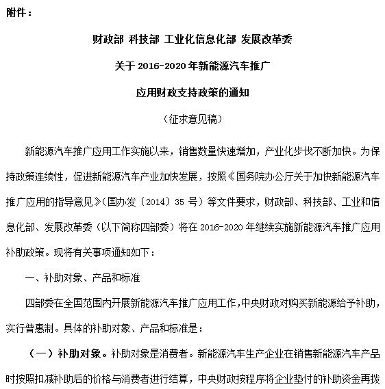 新能源汽車推廣應用工作實施以來,銷售數量快速增加,產業化步伐不斷加快。為保持政策連續性,加快新能源汽車產業發展,按照《國務院辦公廳關于加快新能源汽車推廣應用的指導意見》(國辦發〔2014〕35號)等文件要求,財政部、科技部、工業和信息化部、發展改革委研究起草了2016-2020年新能源汽車推廣應用財政支持政策方案(附后)。現予以公示。公示期為2014年12月30日-2015年1月30日。如有意見和建議,請以書面(個人需屬實名,單位需加蓋公章,并留聯系方式)形式進行反饋。