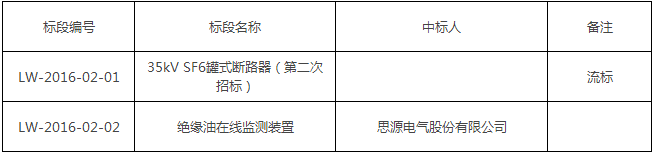 南方主網與海南電網第二回聯網工程第二批物資招標(招標編號:LW-2016-02)工作已完成,經評標委員會評審、推薦,并經公示無異議,招標人確定以下單位為中標人,涉及SF6罐式斷路器、絕緣油在線監測裝置等設備: