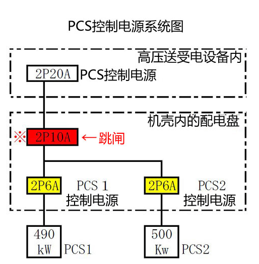 此次故障是因為對PCS的控制電源在開始運轉時會流過多少電流考慮不充分,選擇了容量不足的斷路器而導致的。