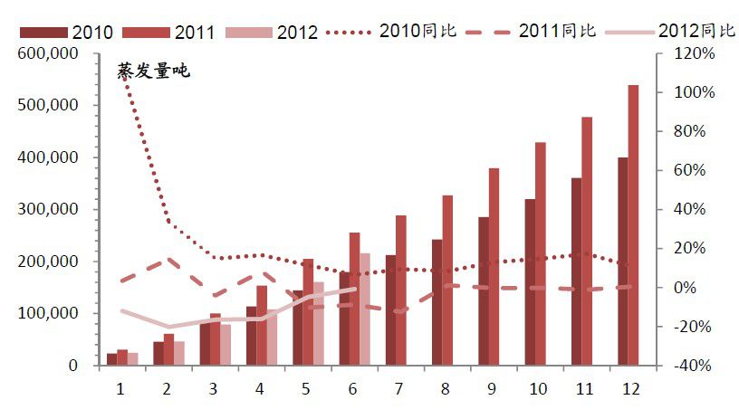 圖:2010-2012電站鍋爐按月累計產量和同比增長率