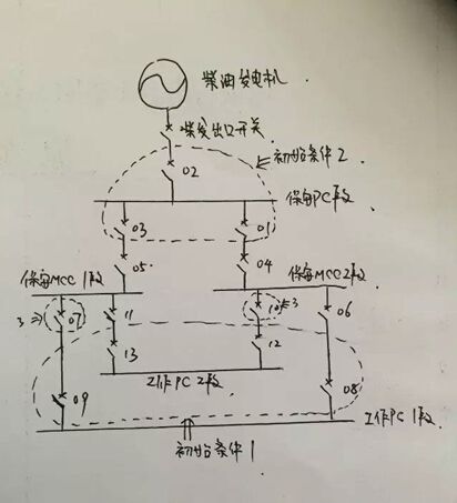 今天說一說保安電源的切換問題,首先我們有三個假設初始條件,如圖(詳見配圖1)初始條件1-3,條件1是饋線開關08、09、12、13在合位,初始條件2是饋線開關01、02、03在合位,初始條件3是饋線開關07、10開關在合位,通過以上初始條件我們知道,初始正常運行時工作PC1段帶保安MCC1段運行,工作PC2段帶保安MCC2段運行。