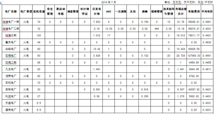 根據《關于印發<華中區域并網發電廠輔助服務管理實施細則>和<華中區域發電廠并網運行管理實施細則>的通知》(華中電監市場價財〔2011〕200號),重慶市電力公司向我局報送了重慶市并網發電廠2014年7月運行考核、輔助服務補償費用結算平衡情況。我局已在本局網站公示,截至目前,未接到發電企業的申訴報告,現批準生效,請依據附表結果結算。