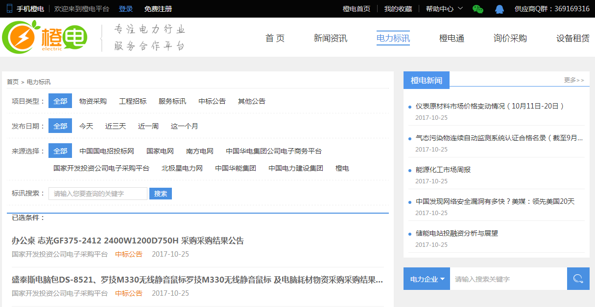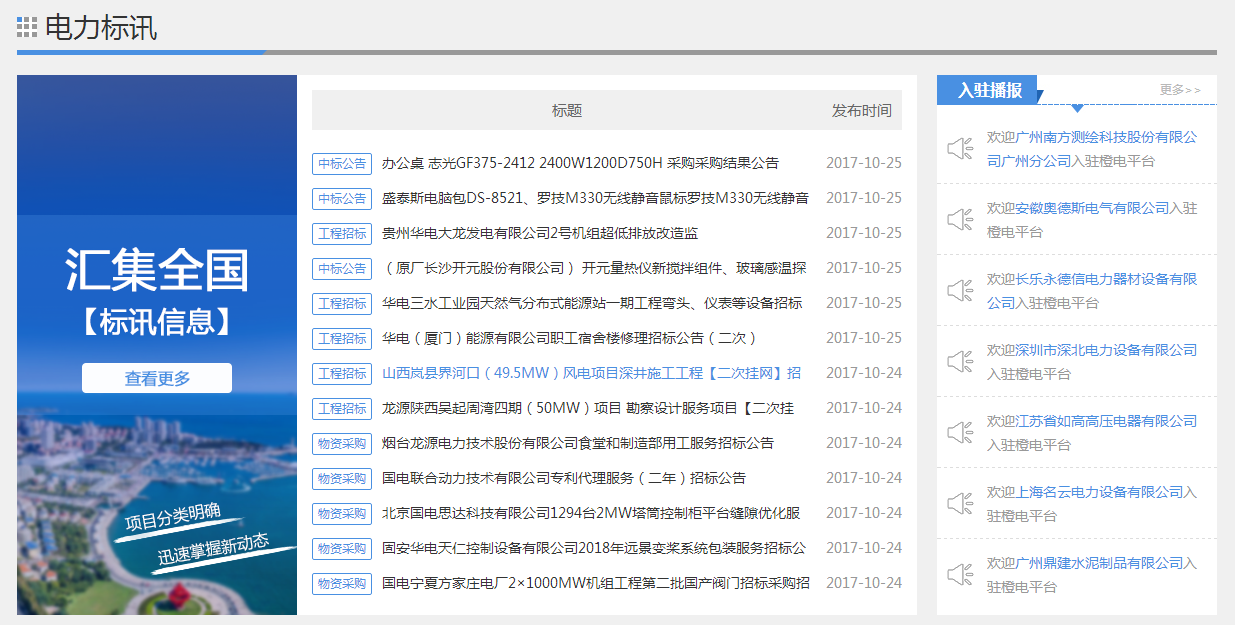 另外,橙電平臺的“電力標訊”更是匯集了國內電力行業的物資采購、工程招標、服務標訊、中標公告等招投標資訊,助力電力企事業單位迅速掌握動態,把握商機。
