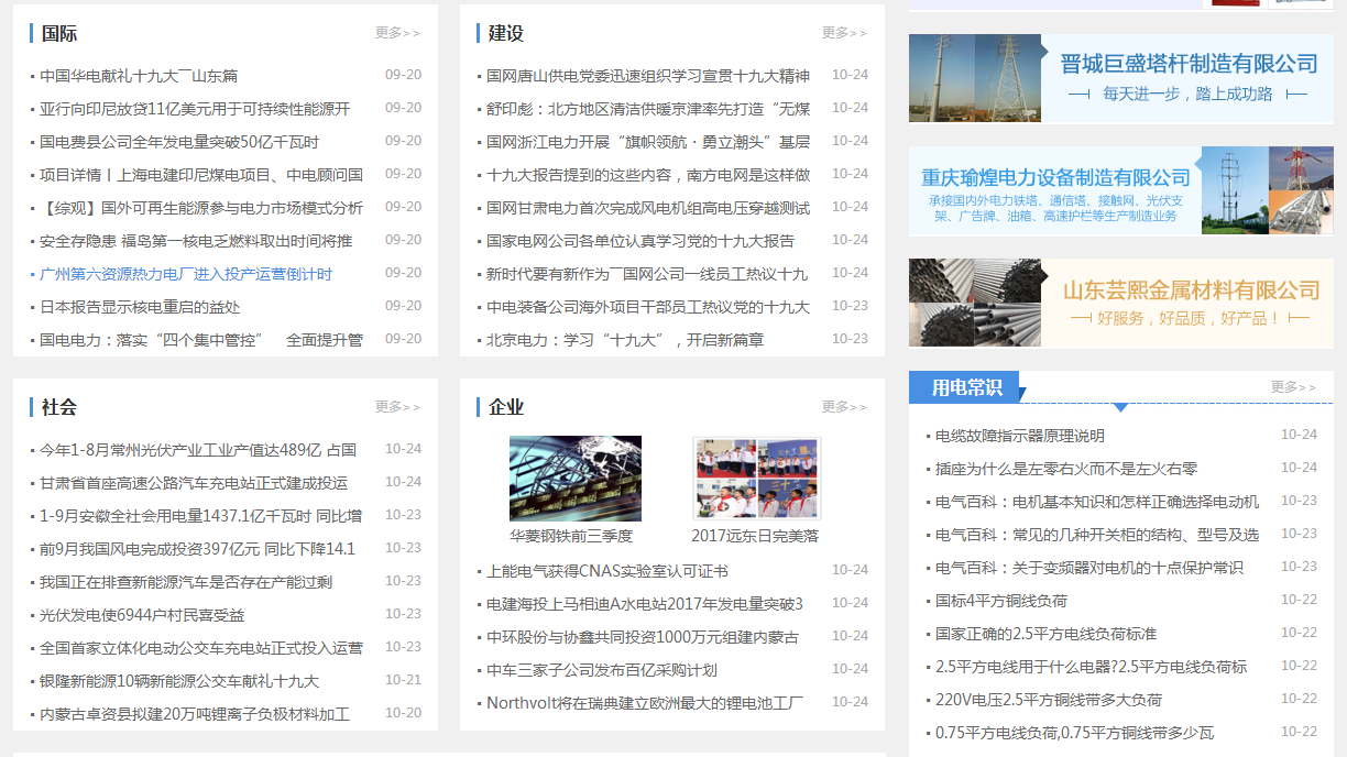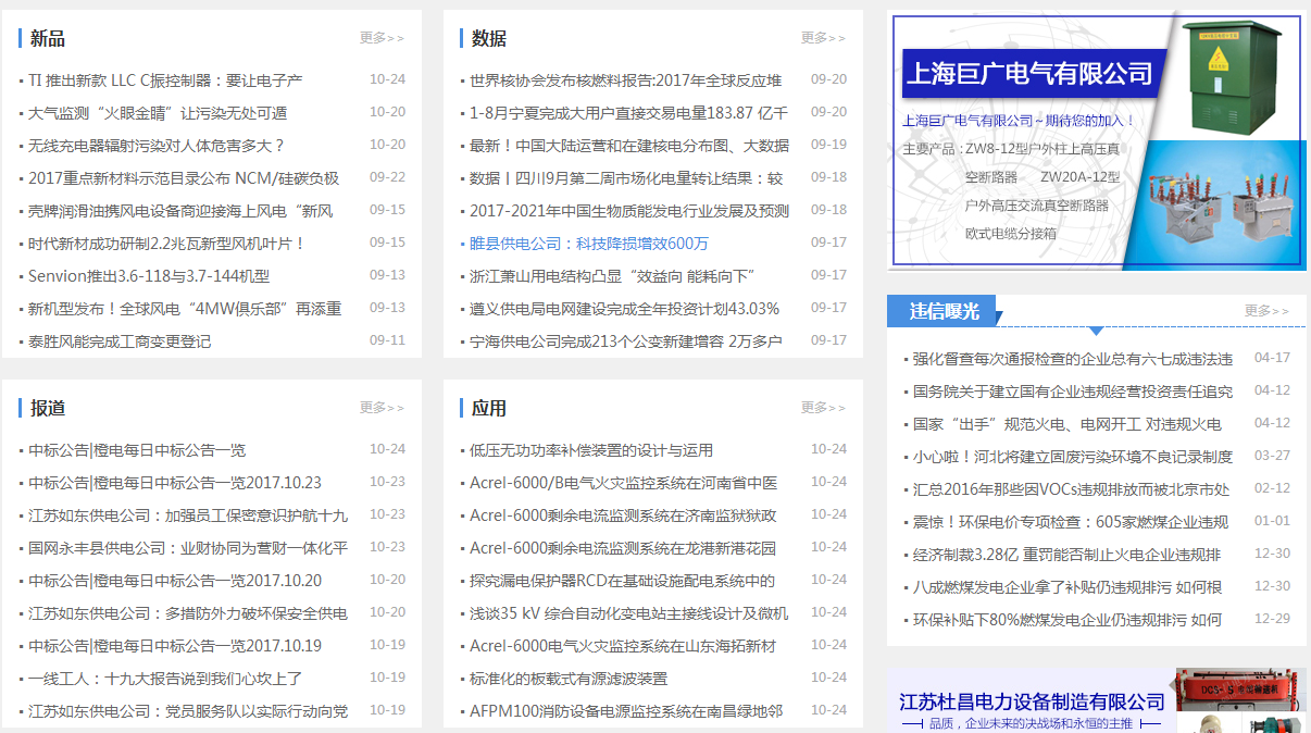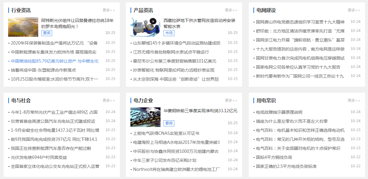橙電新聞網的電力資訊不僅齊全,而且分類十分清晰。橙電新聞網對資訊內容分為七大分類,分別為“電力行業資訊”、“電力產品資訊”、“電力建設”、“電與社會”、“電力企業動態”、“用電常識”、“電力企業違信曝光”。